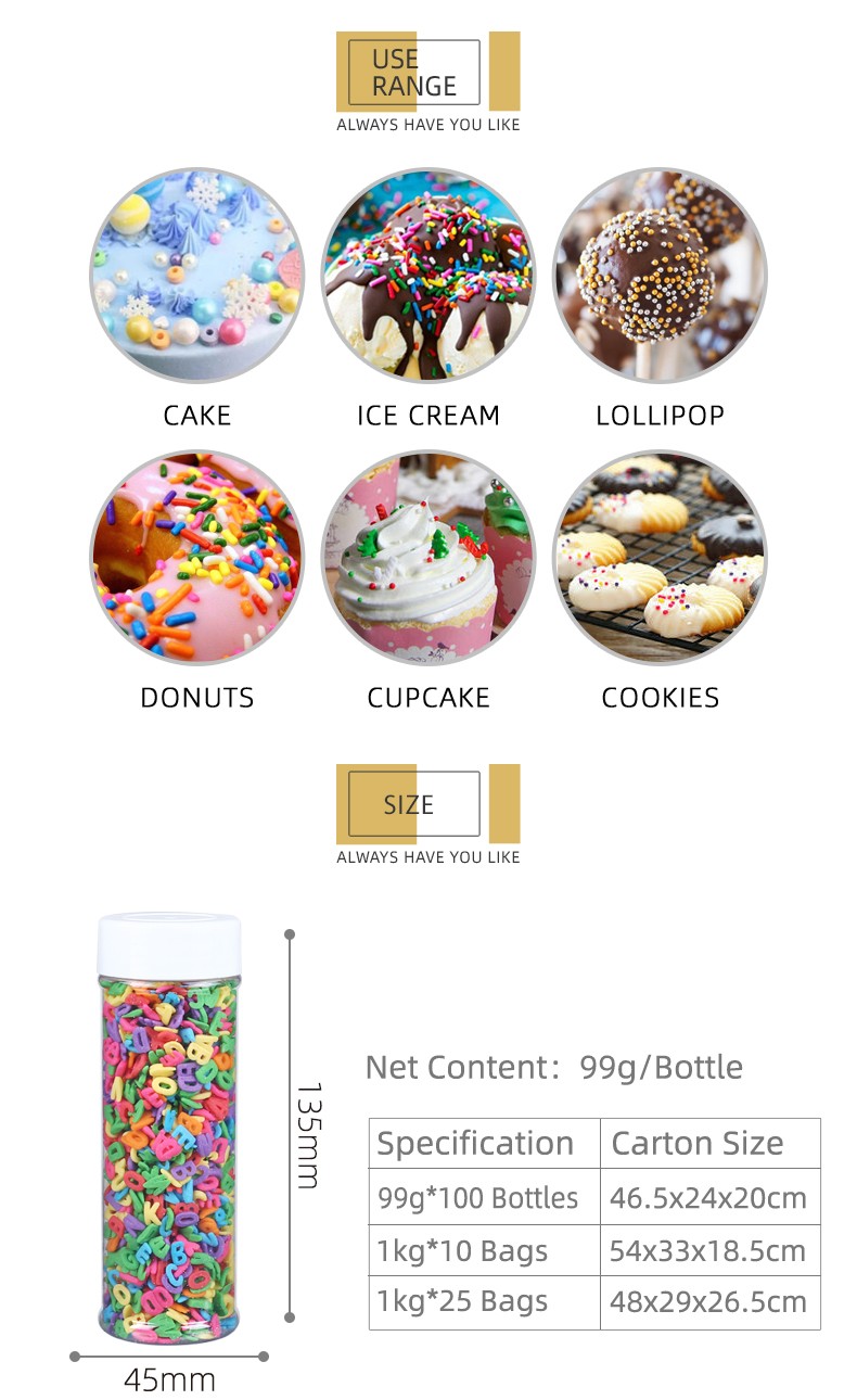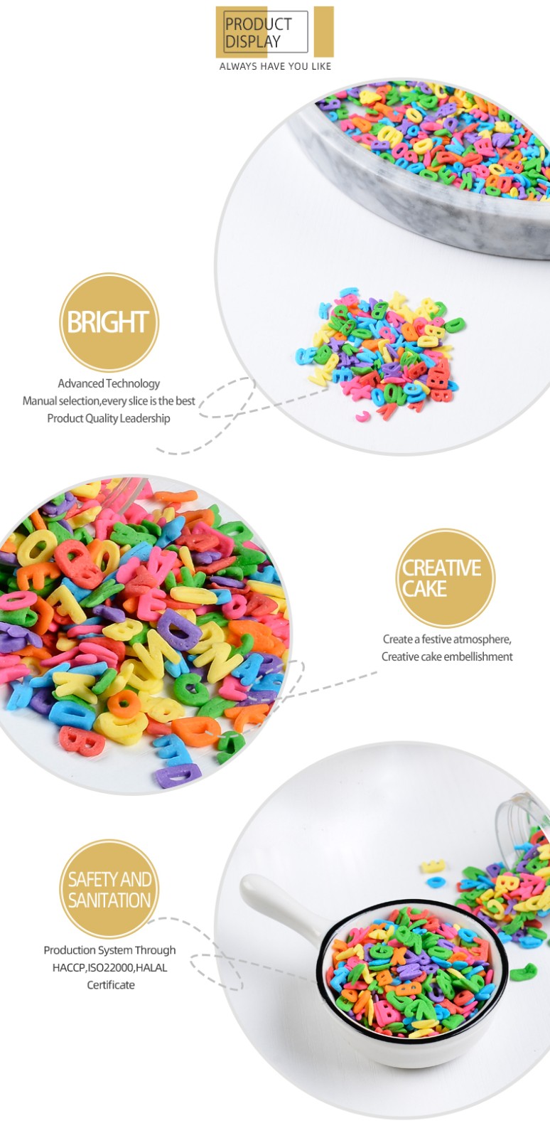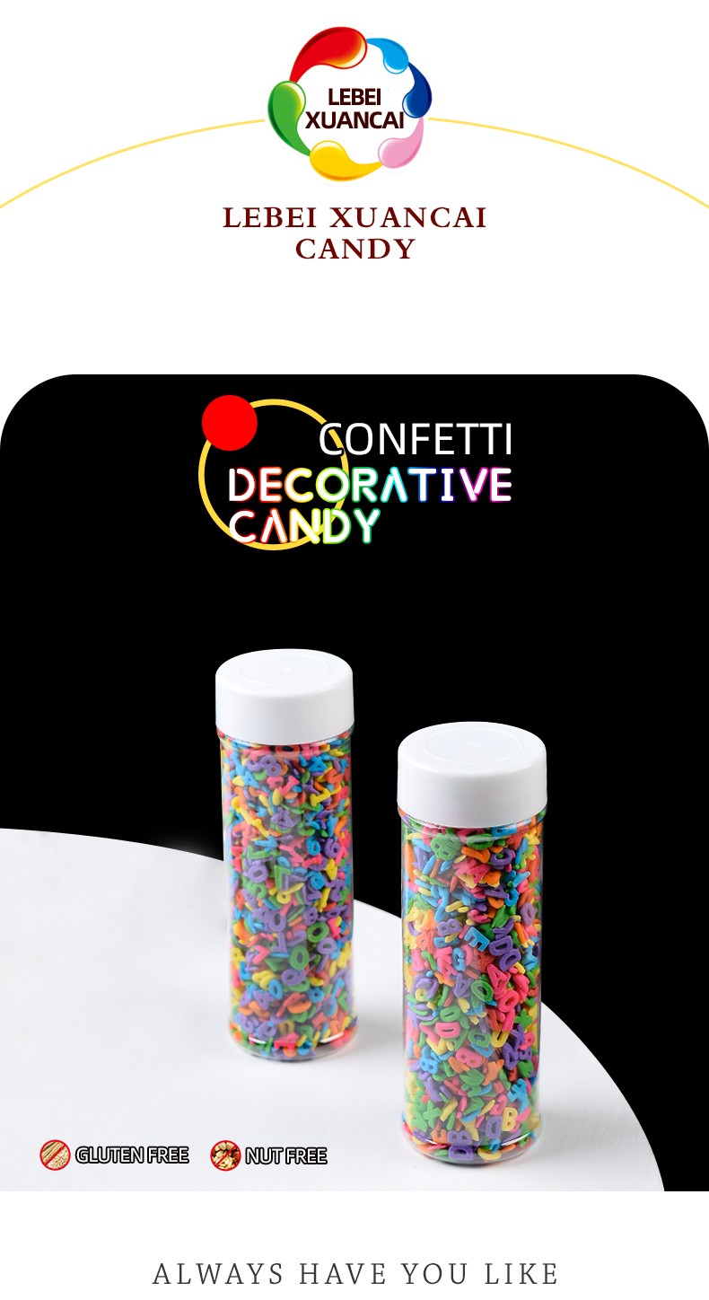 Shantou Hehe Technology Co., Ltd was established in 2017. We are specialized in manufacturing and selling full range of sprinkles candy and decoration candy. We can provide OEM service for customers. Best quality, best service and reasonable prices for all the customers. Our products are widely recognized and trusted by users and can meet continuously changing economic and social needs. We welcome new and old customers from all walks of life to contact us for future business relationships and mutual success!