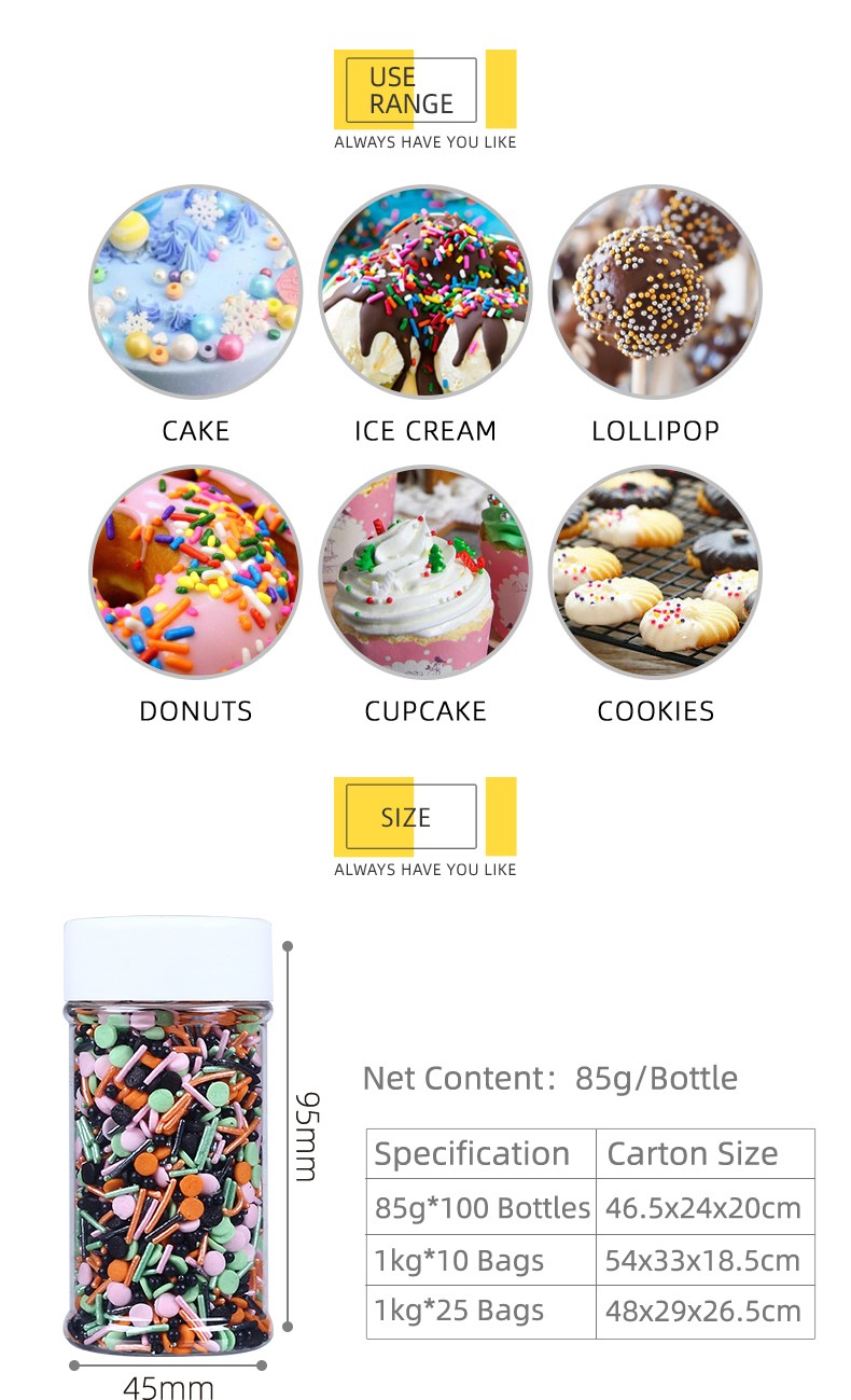Shantou Hehe Technology Co., Ltd was established in 2017. We are specialized in manufacturing and selling full range of sprinkles candy and decoration candy. We can provide OEM service for customers. Best quality, best service and reasonable prices for all the customers. Our products are widely recognized and trusted by users and can meet continuously changing economic and social needs. We welcome new and old customers from all walks of life to contact us for future business relationships and mutual success!