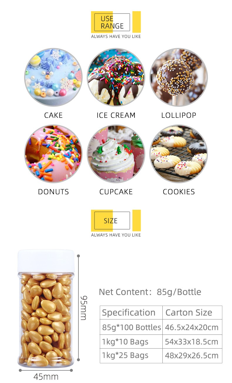 Widely use in cake,ice cream,lollipop,cookies,chocolate.,etc.
