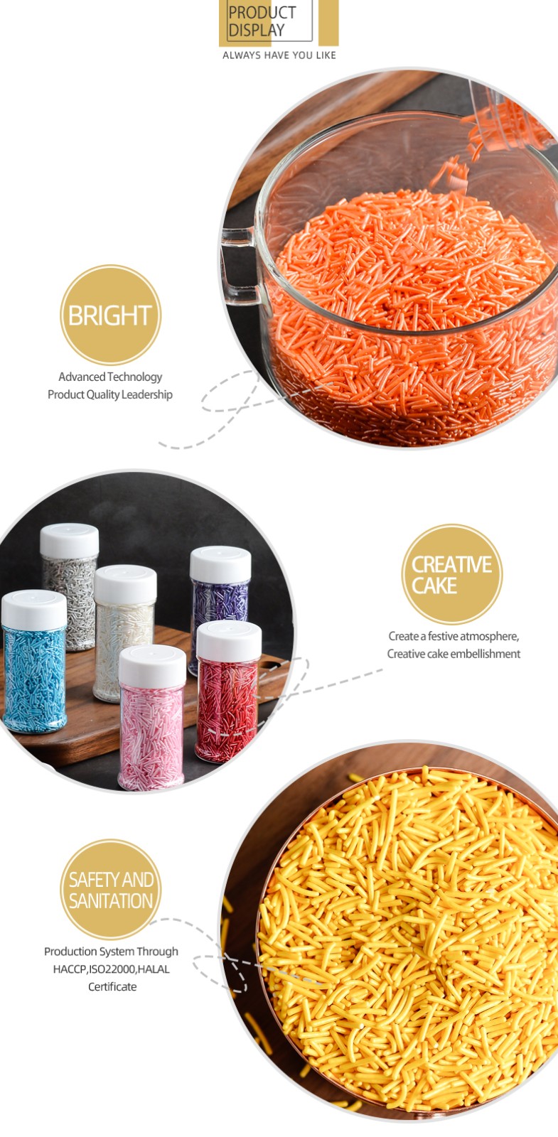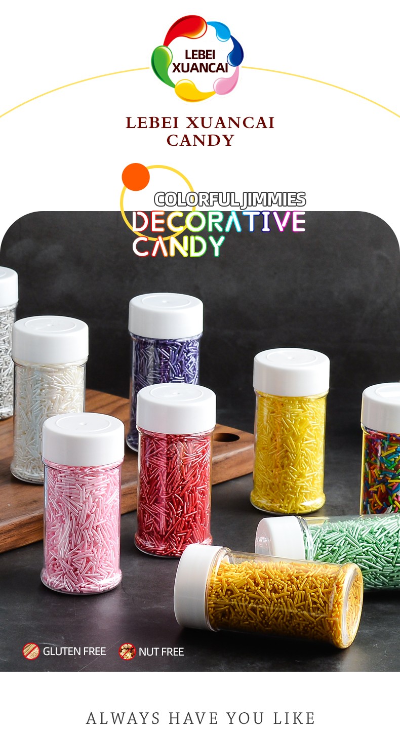 Shantou Hehe Technology Co., Ltd was established in 2017. We are specialized in manufacturing and selling full range of sprinkles candy and decoration candy. We can provide OEM service for customers. Best quality, best service and reasonable prices for all the customers. Our products are widely recognized and trusted by users and can meet continuously changing economic and social needs. We welcome new and old customers from all walks of life to contact us for future business relationships and mutual success!
