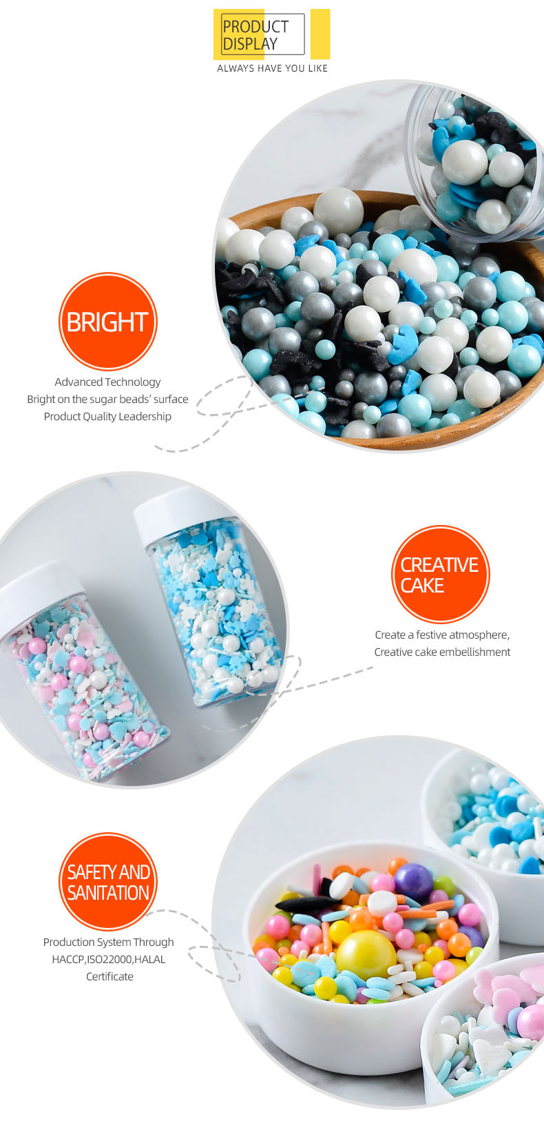 Shantou Hehe Technology Co., Ltd was established in 2017. We are specialized in manufacturing and selling full range of sprinkles candy and decoration candy. We can provide OEM service for customers. Best quality, best service and reasonable prices for all the customers. Our products are widely recognized and trusted by users and can meet continuously changing economic and social needs. We welcome new and old customers from all walks of life to contact us for future business relationships and mutual success!